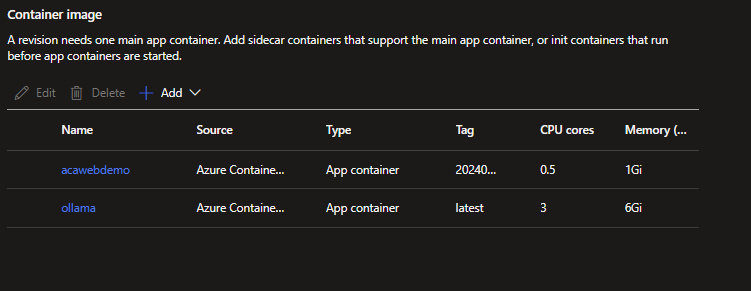 At this point, we have deployed just the web app to Azure Container Apps. We will now bring in our Ollama image in Azure Container Registry as a complimentary sidecar container in the same Azure Container App instance where our web app has been deployed to (The Ollama container does not necessarily have to exist as a separate Azure Container Apps instance).