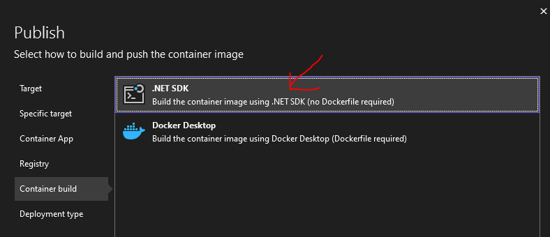 After Building the solution successfully, Right click on the web project, Publish to Azure > Azure Container Apps (Linux) > [Your_New_or_ExistingContainerApp] > [Your_New_or_ExistingRegistry] > .NET SDK Build :