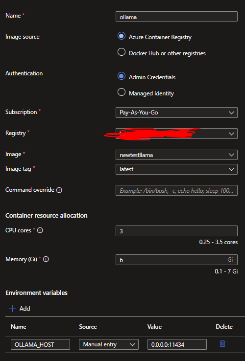 First, go to the Azure Container Instance > Containers > Edit And Deploy > Add Sidecar . Then set the parameter to the following making sure you set an Environment Variable OLLAMA_HOST as below since the Ollama container needs this to operate normally and allow it to serve requests on port 11434. Then click Save: