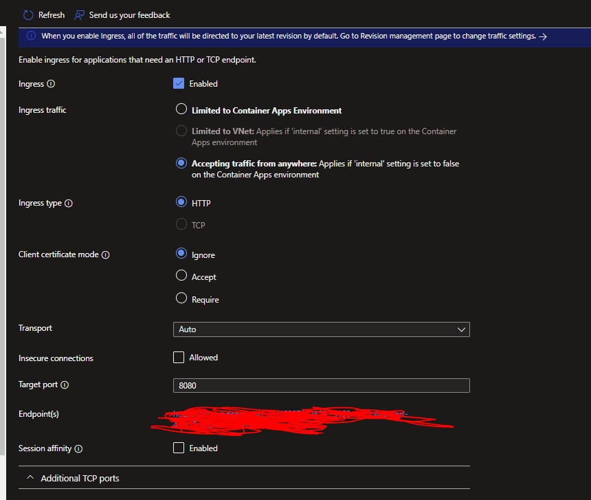 Under the Ingress Settings on your ACA instance, set the following Ingress settings to allow you to view the web page later on, making sure to untick Insecure Connections. Then click Save:
