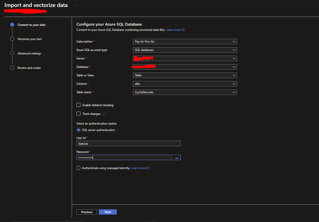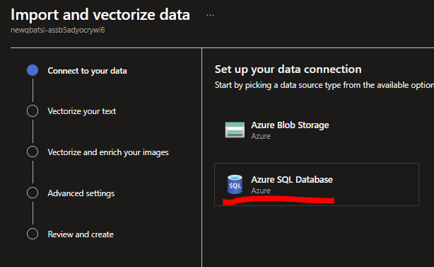 Next, from our Azure AI Search resource, we can import our SQL data using the guides from the wizard under [Azure AI Search Instance>Import and Vectorize Data]: