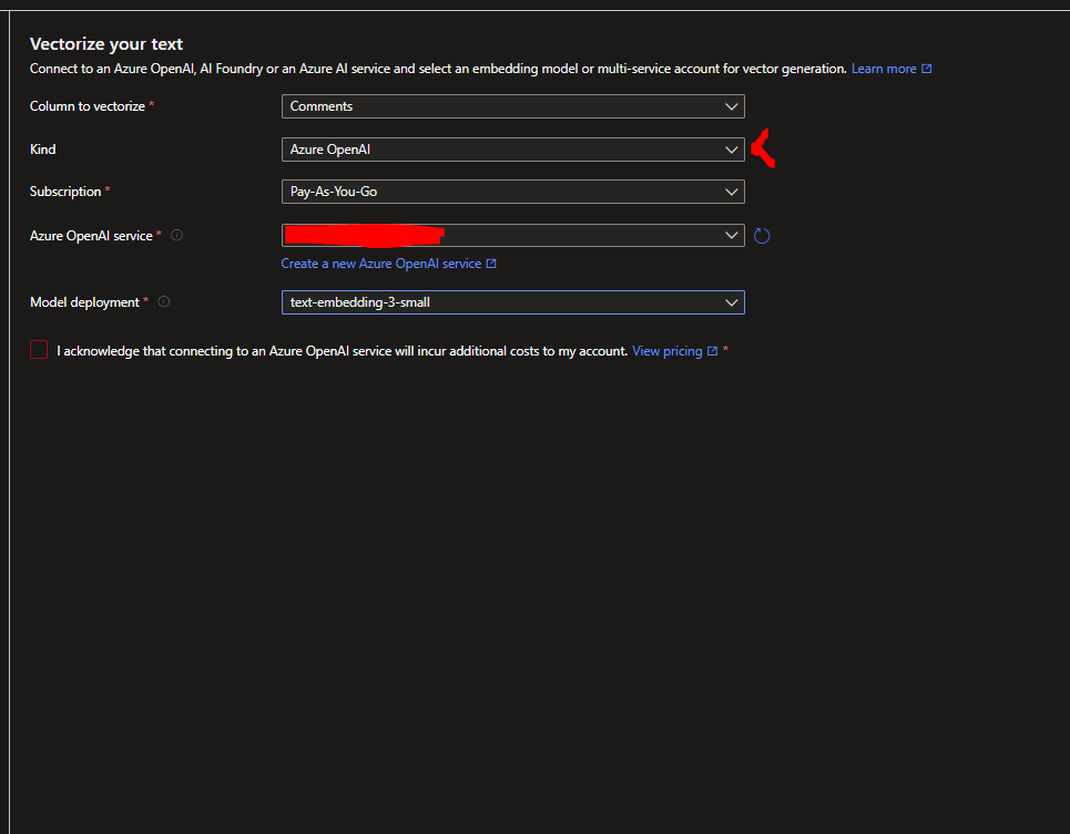 Next, choose a column to vectorise and thereby semantically understand. Your Azure OpenAI Service here must have an embedding model already deployed in Azure AI Foundry already: