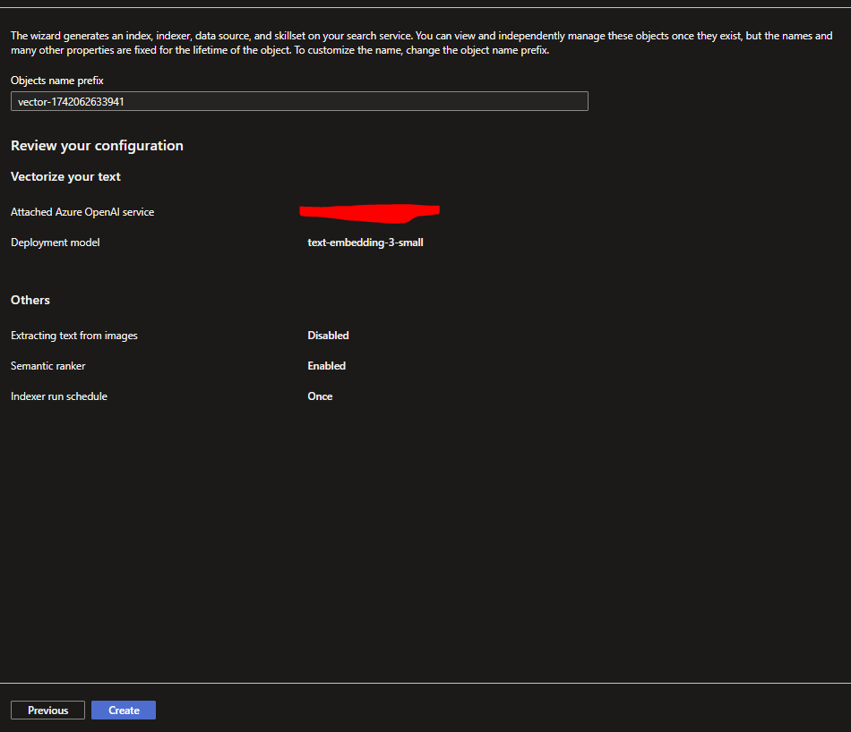 Click create and then keep note of the vector Index name given and also the vectorised column/field that it will create (which is called "text_vector" in this case):