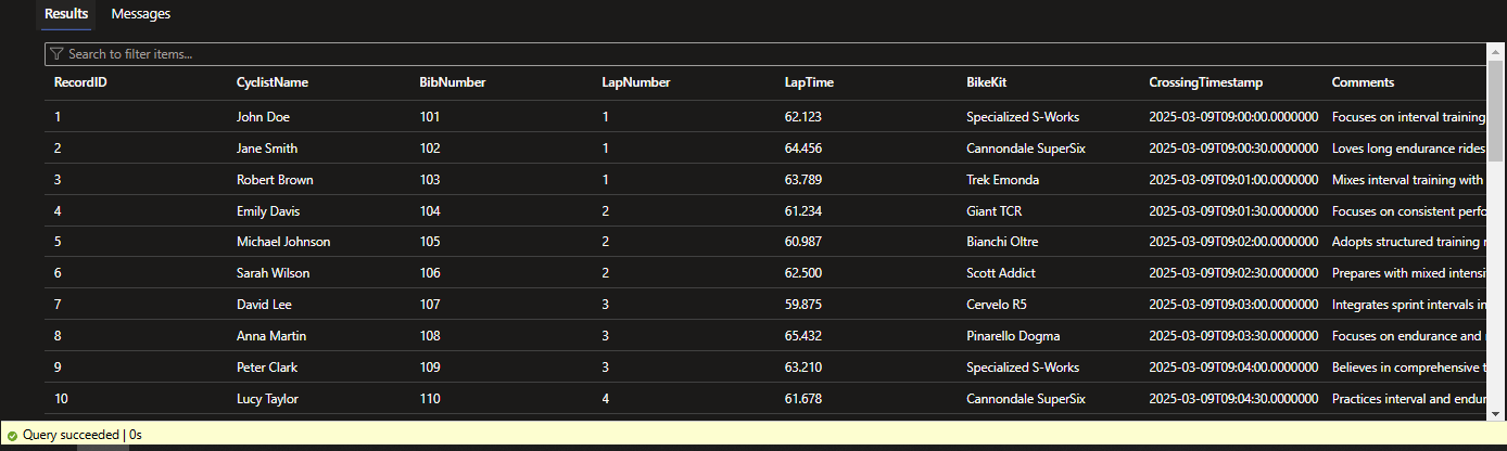Let's imagine we have an Azure SQL Database as our source data such as this that I have nicely generated for this post about bikers/cyclist in a lapped race, their kit, and their training regimen: