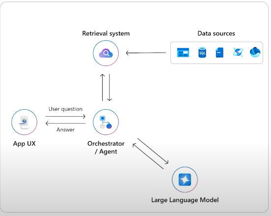 Ultimately, apps can eventually realise an architecture that is representative of the following, where a user interacts with some kind of question and 'smart answer' system that is able to use the query and return results based on semantic understanding of the existing data automatically to then act on it in a generatively should we choose, unlike traditional 'keyword matching' search. This is what we call Retrieval Augmented Generation (although there is a further technique that combine both approaches called Reciprocal Rank Fusion but is not discussed here):