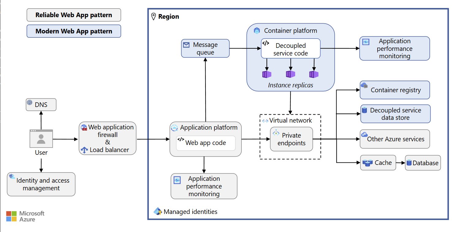 Modern .NET apps running in Azure can reliably operate using a design pattern known as the Modern Web Pattern for the cloud. The Modern Web Pattern relies on the usage of a message queue, a container platform, a decoupled data store, and a container registry. The focus is to truly exercise the notion of decoupling services that serve the application as a whole so that upgrades and fault handling are managed separately and independently. It moves away from the notion of monolithic principles where the application itself has singular ties to every service that it would need to use or singular chain of command whereby a failure in any part of the call chain, results in the whole or critical part of the application not working.