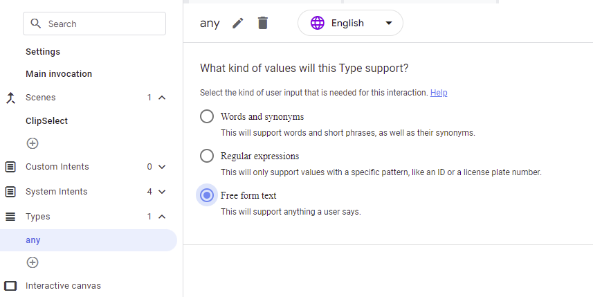 To accept the text from any Suggestion chip chosen, we can create a custom Type that accepts Free form Text. From the left hand menu, expand Types, then type in the word any, press Enter. The panel in the middle should show a radio button selection for the kind of values to be accepted. Choose Free form text and then click Save: