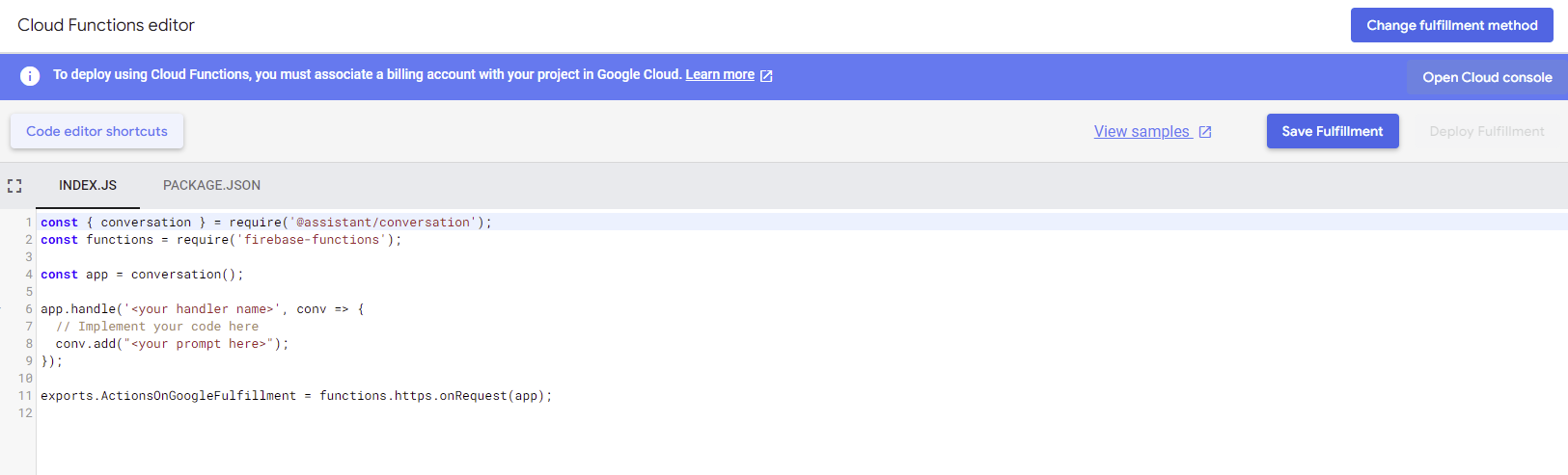 Click Confirm and this should open an Editor for Index.js. Before you start you will need to associate the project with your billing account as instructed. Click Open Cloud Console to Link the project to a billing account and follow the instructions there. This will be your Free trial account or your paying account: