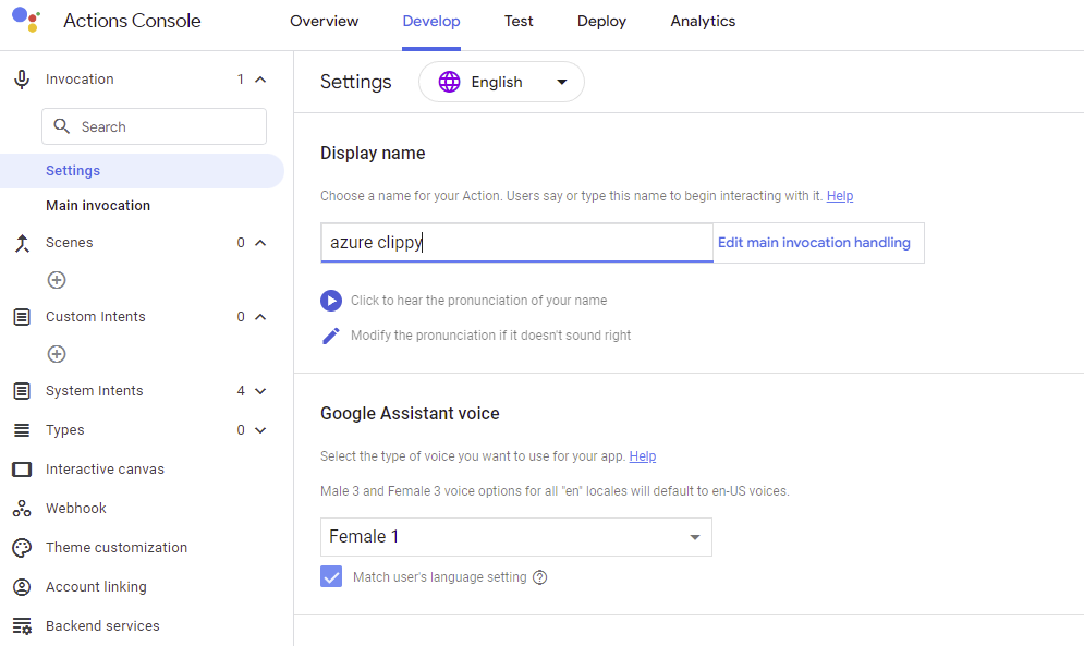 After loading, navigate to the Develop Tab and set a display name and Assistant Voice under Main Invocation > Settings, making sure you press Save afterwards:
