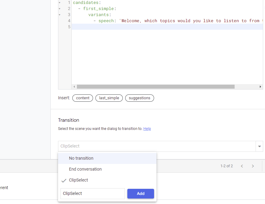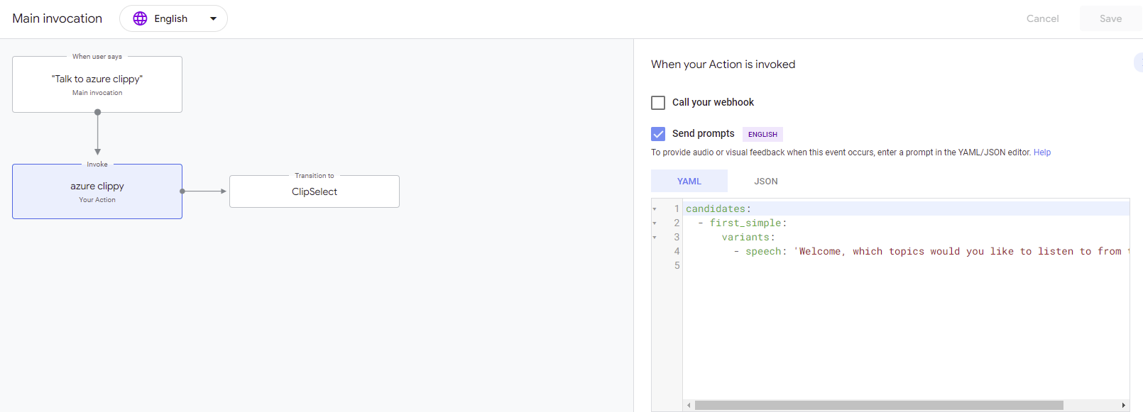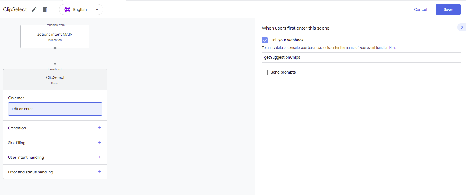 After clicking Add, you should be taken to a Scene page for ClipSelect. In the On Enter section, click the + icon, then on the right hand side, tick Call your webhook, and type getSuggestionChips in the text box and click Save. This will allow a call to a webhook to execute javascript code when the user Invokes the Action: