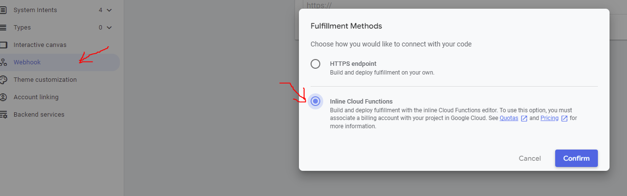 Next, we need to define what 'getSuggestionChips' will do. We can do this by clicking the Webhook section on the left-hand menu. If this is your first time using this, choose Inline Cloud Functions: