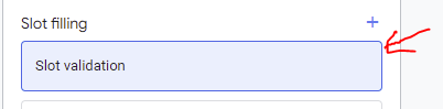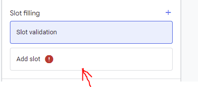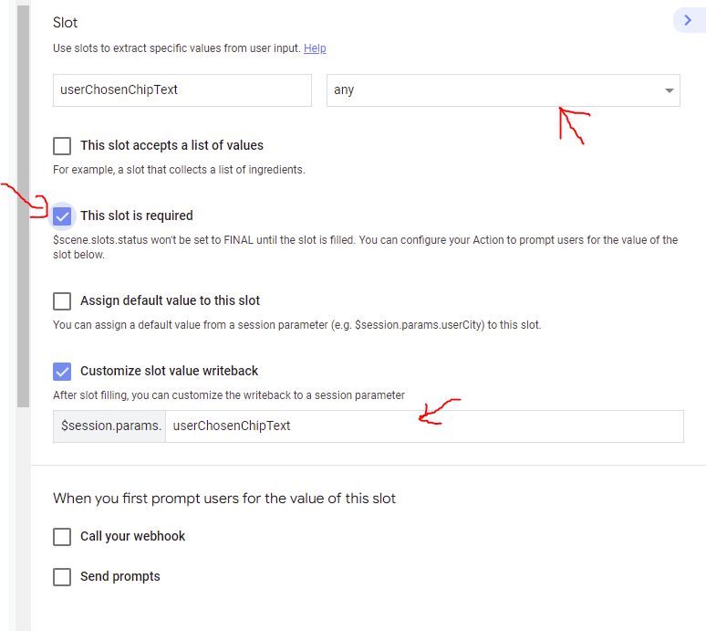 On the right hand side, add a Slot Name that follows that 'any' Type created earlier, and call this userChosenChipText. This will mean that the Google Action will look to satisfy a user input that matches free form text (which will fill the slot). Check 'This slot is required' and also notice the session.params.userChosenChipText slot value Writeback (more on this later):