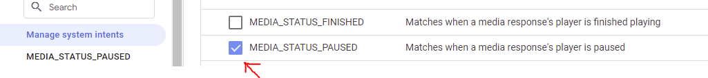 Lastly, to handle a pause event when the user clicks pause (and for resuming), navigate to System Intents > Manage System Intents and Enable MEDIA_STATUS_PAUSED and click Save: