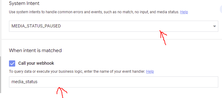 Next on the right hand panel, select the MEDIA_STATUS_PAUSED Intent from the dropdown, check Call your webhook and add the name media_status for the webhook event handler: