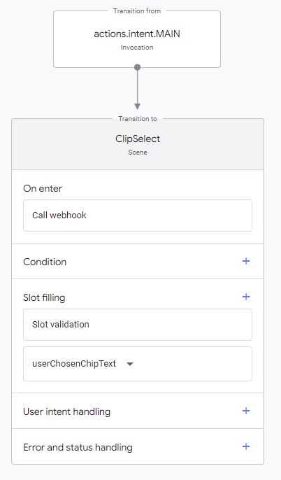 Now go back into the ClipSelect scene to add this Intent as part of status handling. Click Scenes > ClipSelect, scroll down the flow diagram and add an entry for Error and Status handling: