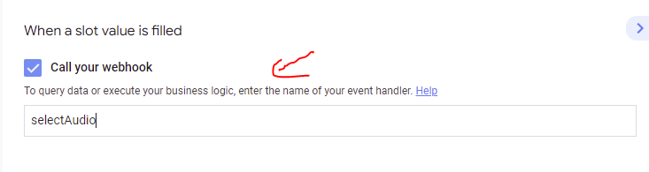 Next on the right hand side, check 'Call your webhook' and type in selectAudio: