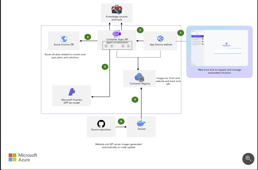 This workload according to Microsoft aims to allow employees to access a web front end to manage automated solutions that are supposed to carry out tasks through the use of AI Agents that are in turn orchestrated by a central 'Container Apps API" in the form of a Container Apps Instance. In the workflow, the users require a web front end to access the management panel to make requests and set parameters. The requests are routed to Knowledge sources and other tools to achieve the desired outcomes of the front end.