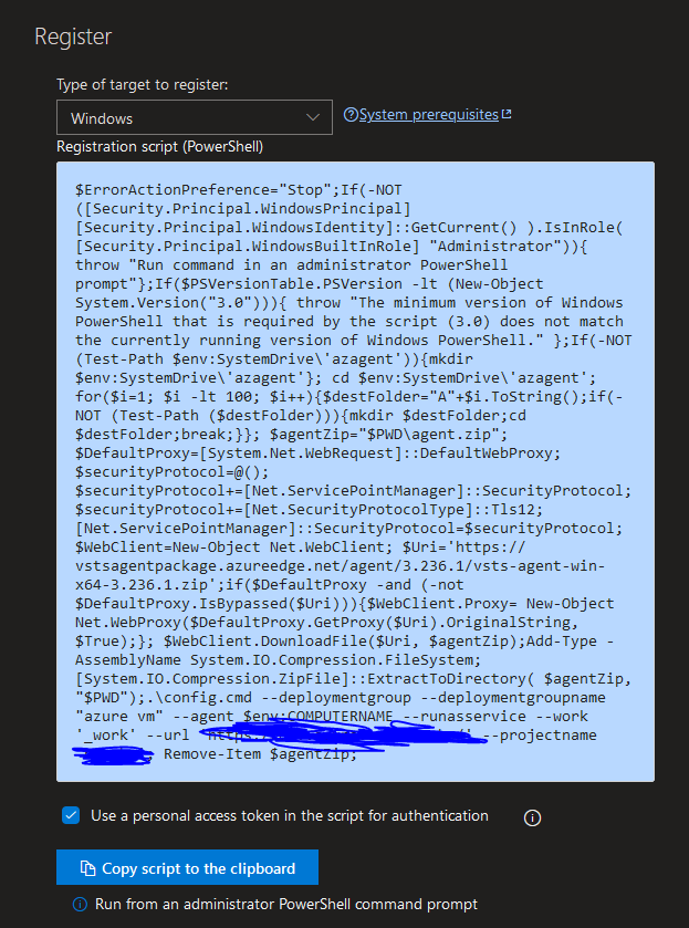 You will get a Powershell script displayed to you. Select your Target OS (I'm using Windows for my target server), check 'Use a Personal Access Token in the script for authentication', then Copy the script to your clipboard: