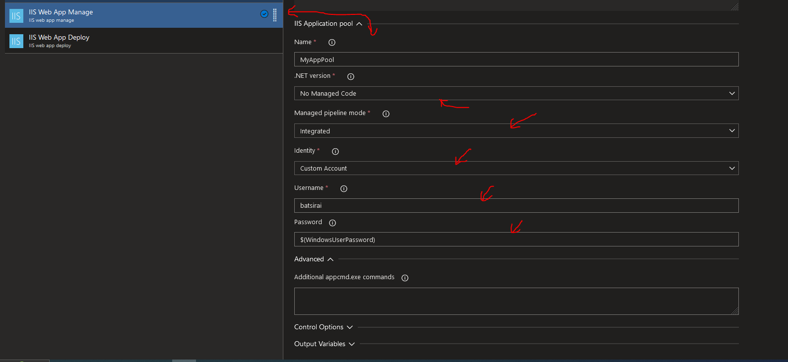 If Creating an AppPool, there will be further configuration on scrolling down further still on the 'IIS Web App Manage Task'. If setting a Custom Account User and Password for the AppPool authentication, you can set the Password here directly but try to avoid that. Instead use a Task Variable as seen below which you can read on how do that quickly from my blog post here (doing so prevents sensitive items like passwords being printed in logs in plaintext when we run the pipeline). Continue as follows: