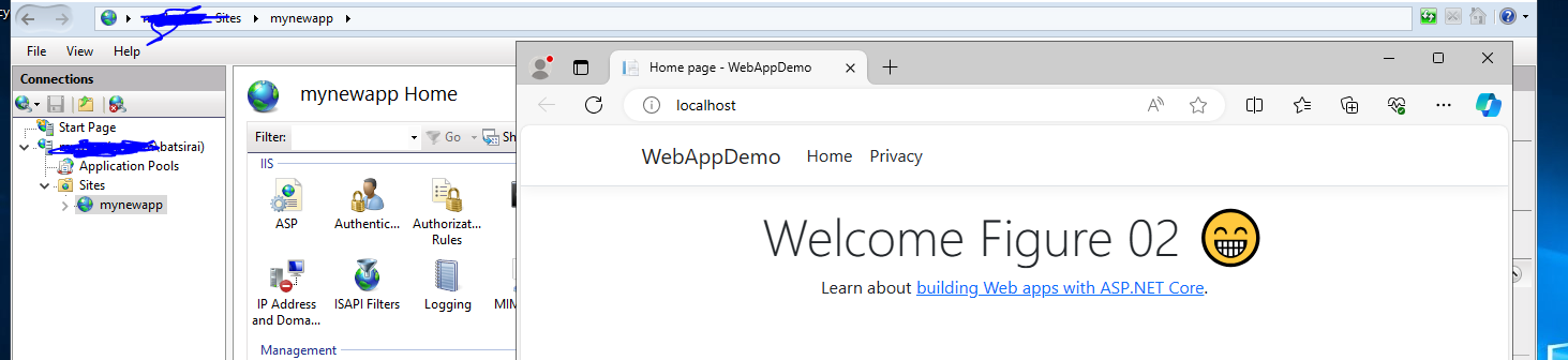 We can hop on over to the the server/VM or Azure VM, and checking in IIS we should see that our web app has been added and browsing into our application from IIS lands us on the Home page!!!