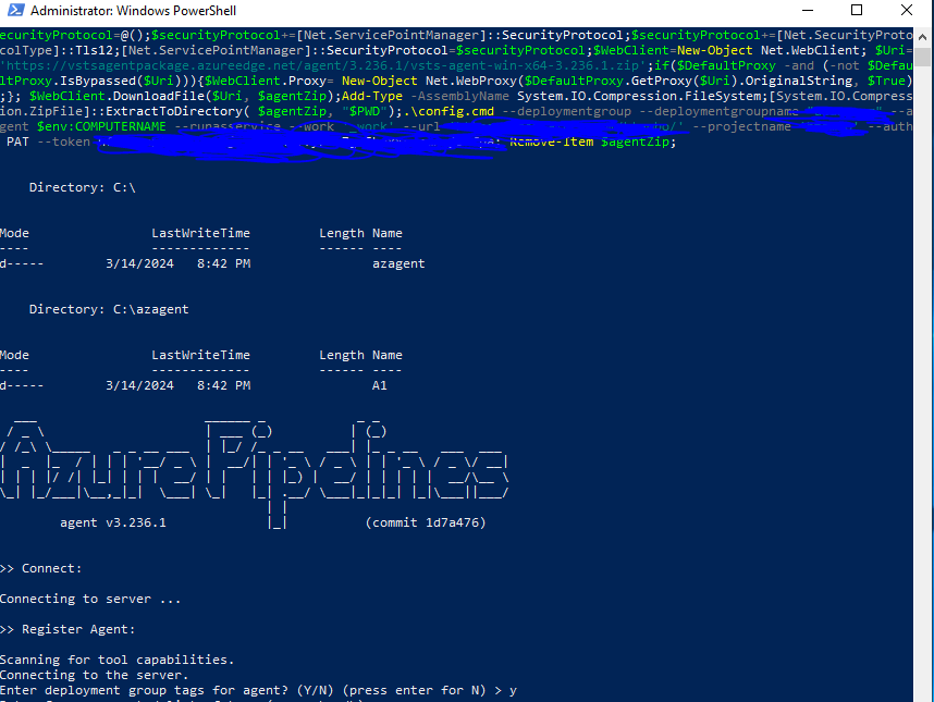 With the script ready, we will use it to install the Azure Pipeline Agent Service on our Virtual Machine or on-premises Server, which will run as a Windows Service (or Linux daemon on Linux) to orchestrate communication between the VM/Server and Azure Devops. Open an Administrative PowerShell window on the target machine, paste your script and Enter to run. You should see something like the following: