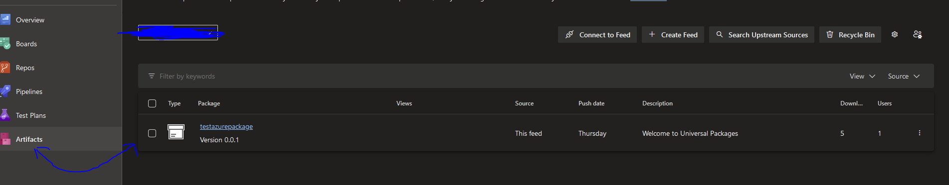 You should now have your Artifact in the Artifacts section in Azure Devops that you would have otherwise typically built from a Build pipeline. With a Universal Package deployment you should see something like the following in the Artifacts section: