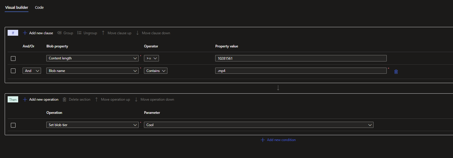 This Storage Task will simply take a look at all blobs that meet the conditions of being more than 10MB (the blob Content Length or size is set in bytes) plus containing the .mp4 extension in the name, and then will set the blob tier to 'Cool'. This means those blobs will be moved to slower read access storage in Azure, reducing our general 'at rest' costs for these particular blobs.