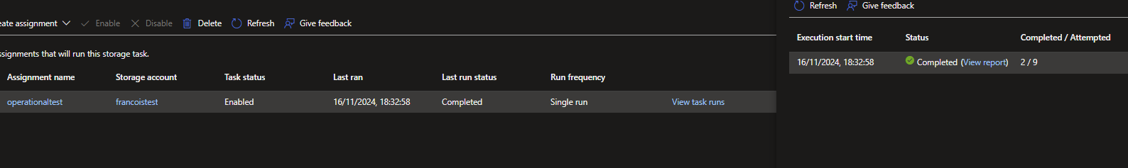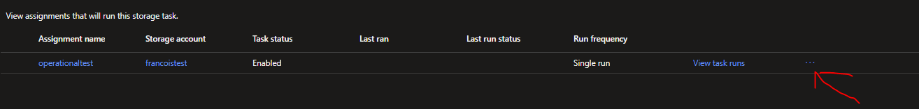You now need to add an 'assignment' to the Task you have just made to allow it to run on a specific storage account.
