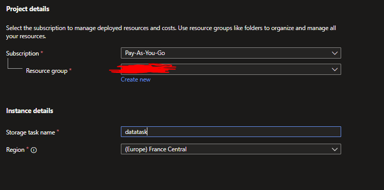 In the Azure Portal, search for Azure Storage Actions and create the resource in a supported Region (this is preview at the time of writing) for your target resource. Set a Storage task name and click Next: