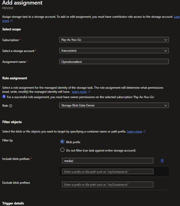 It is important to note that for the above screenshot, it will be cost effective to try and limit what is assessed to a specific blob container prefix. You can add further multiple assignments for different containers perhaps for clearer distinction. If you happened to have millions of blobs or containers, the run would take quite long to scan all files, and you would be charged for all of those read operations!! Scope your containers carefully.
