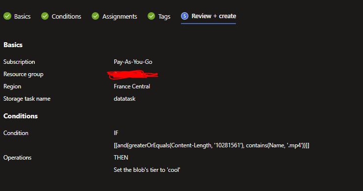 Click Next and also skip over Assignments and Tags for now by clicking Next (this will come later), then Review and Create the Storage Action resource: